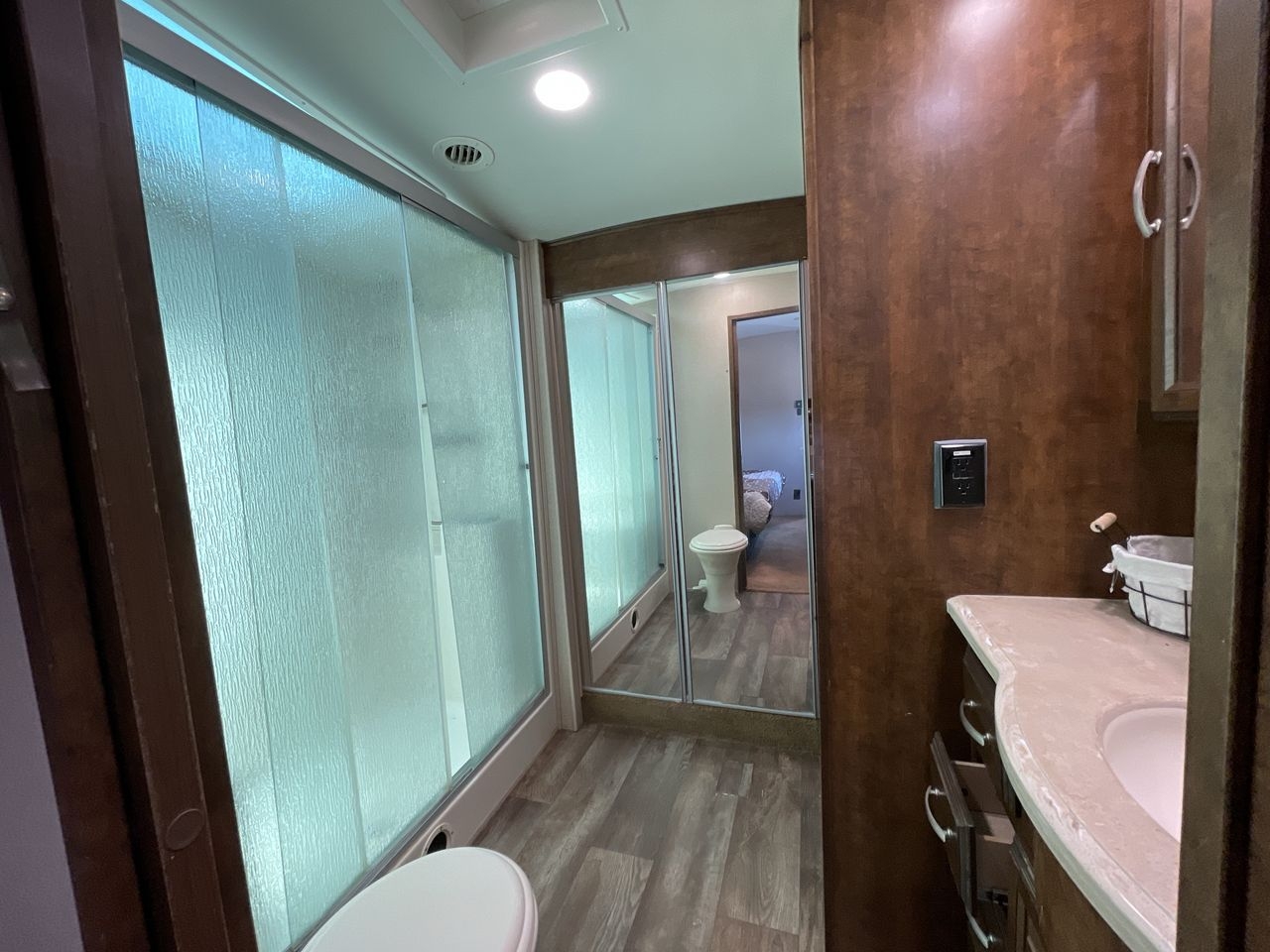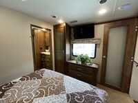 - Living Area: 90" sofa hide-a-bed, two leather recliners, and a 58" pop-up TV with fireplace.