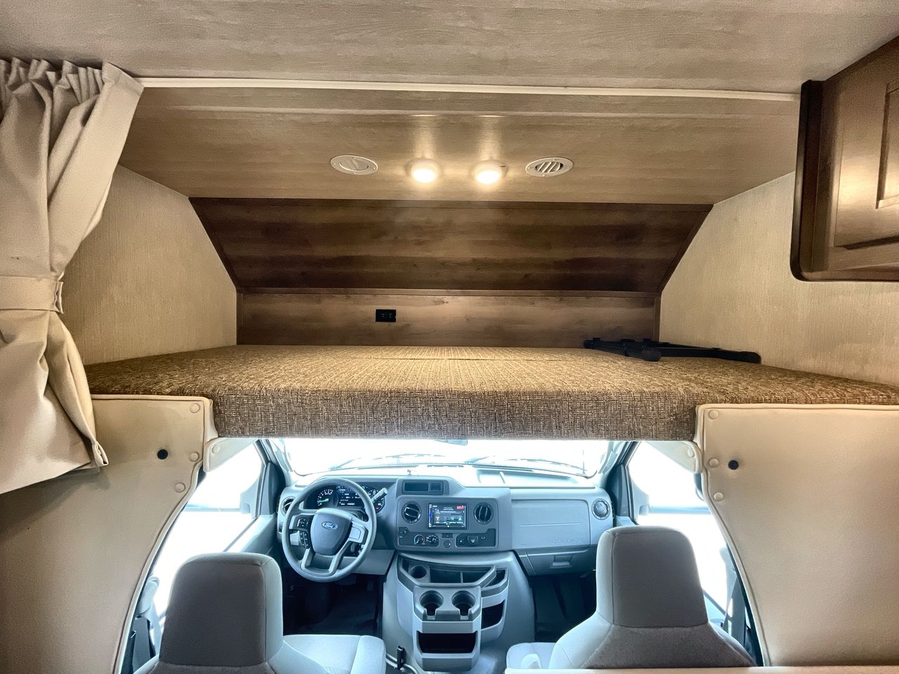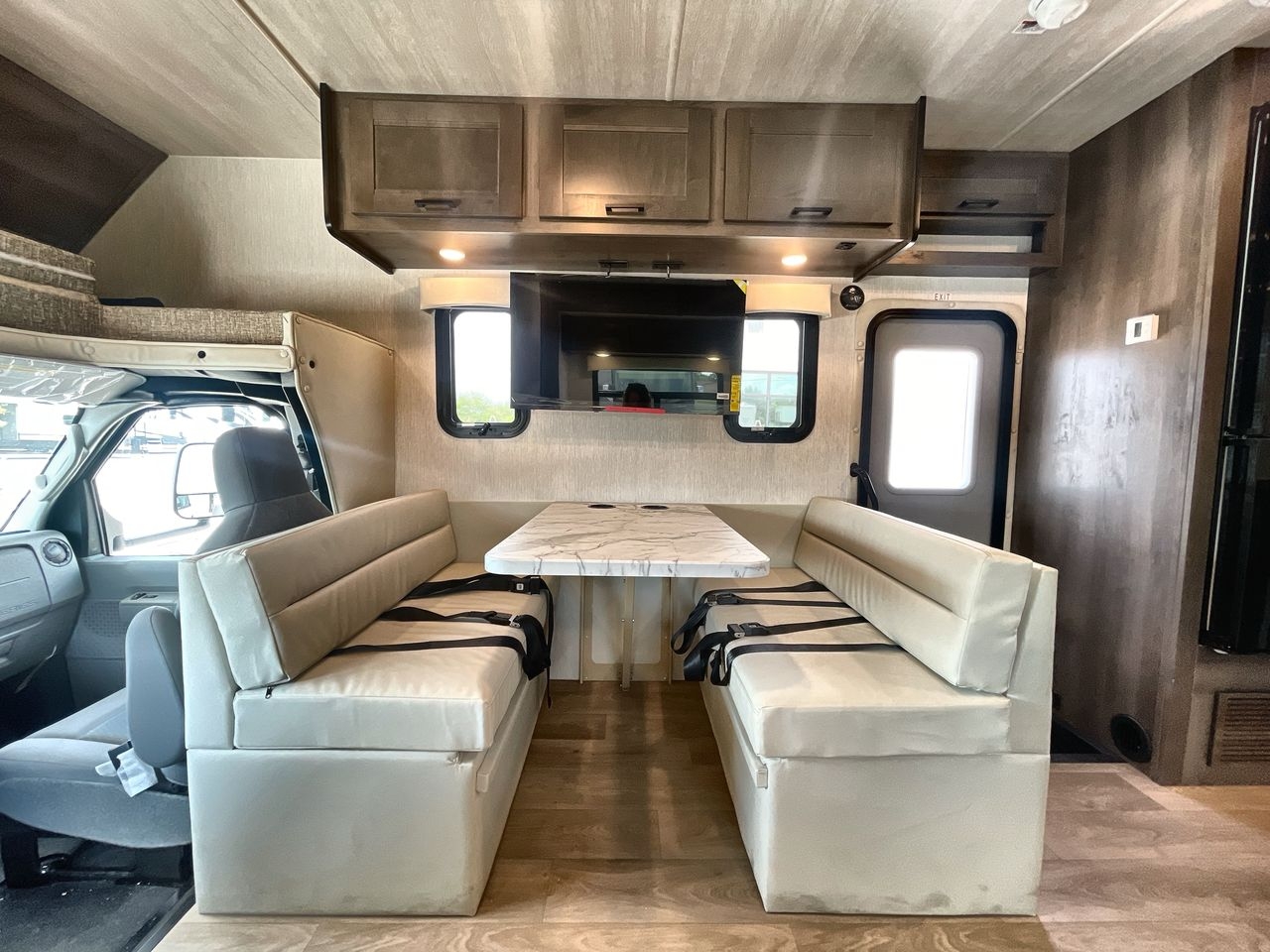 - Living Area: hide-a-bed sofa, convertible booth dinette, 40" living room TV, overhead cabinets are available, Bunk over cab